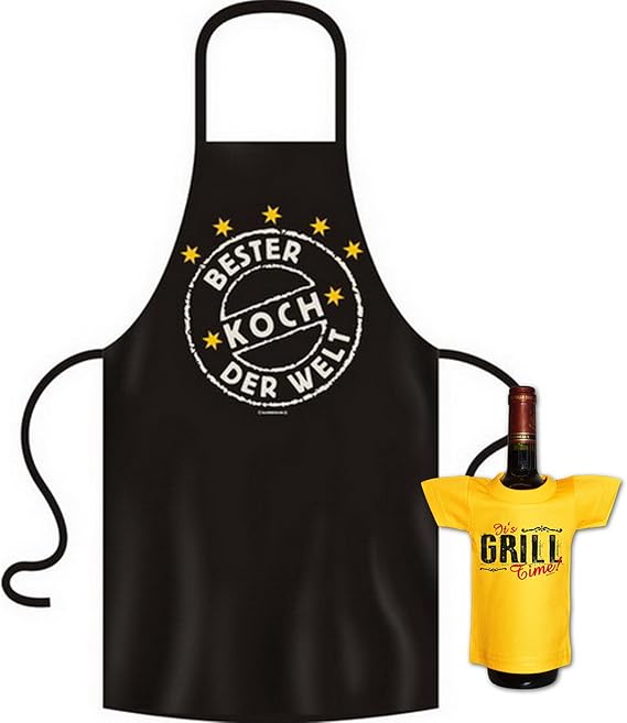 Kochschurze Manner Bester Koch Der Welt Grill Bistro Kuchenschurze Schurze Manner Geschenke Set Geil Bedruckt Mit Mini Flaschenshirt Ohne Flasche Amazon De Garten